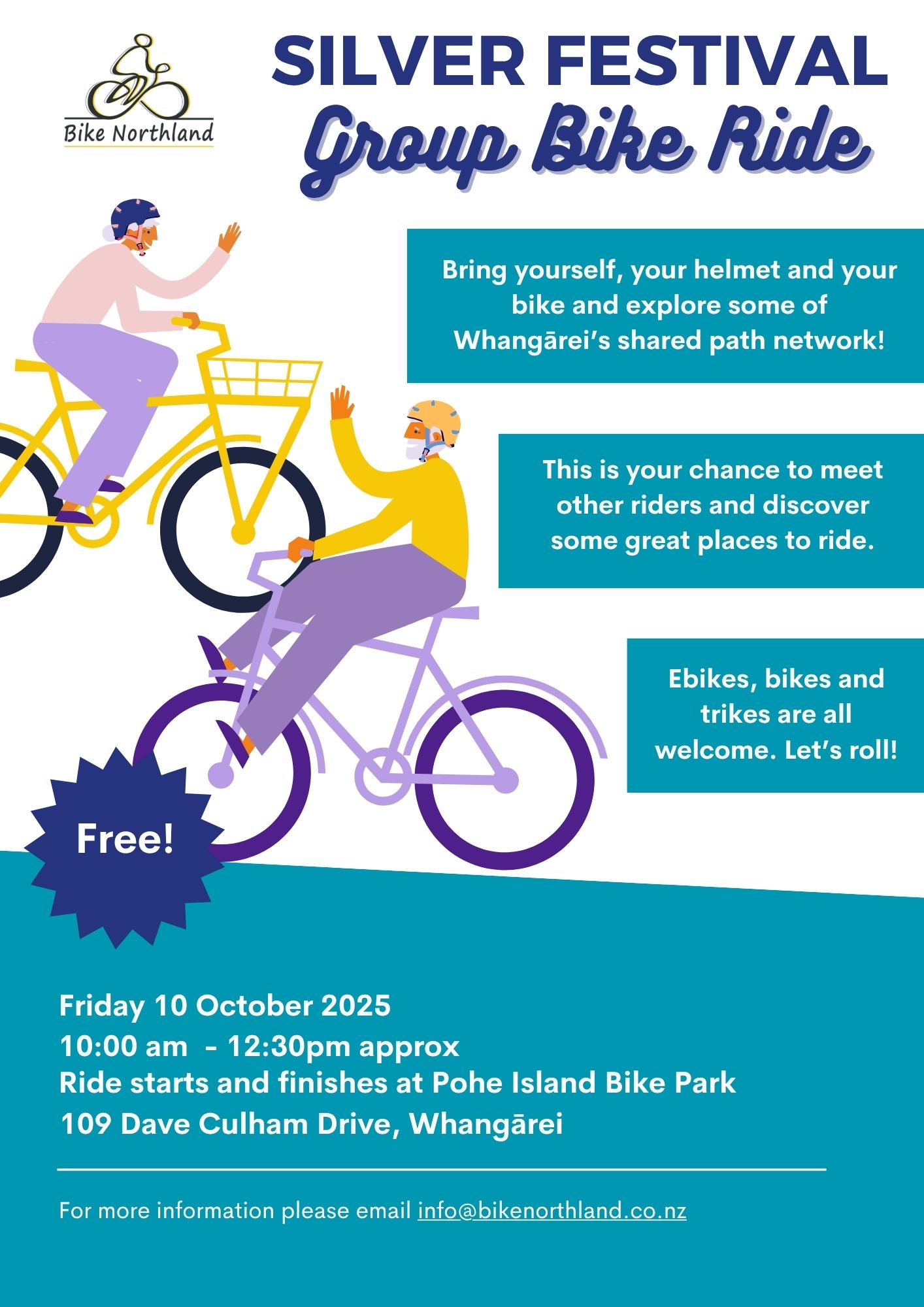 A group bike ride for adults as part of the Whangarei Silver Festival. A chance to meet other riders, share ideas and explore Whangarei's Shared Path network. Bring your own bike and helmet, a jacket and water bottle would be good too. We may even stop for a coffee :-) Start and finish at the[Read More]